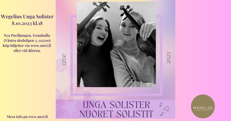 Nuoret Solistit – konsertin aikana kahdeksan solistia esiintyy yhdessä Wegelius kamarijousien kanssa, Jutta Seppisen johdolla. Konsertin aikana kuullaan myös kantaesitys Wegelius Nuoret Säveltäjät-kilpailusta.
