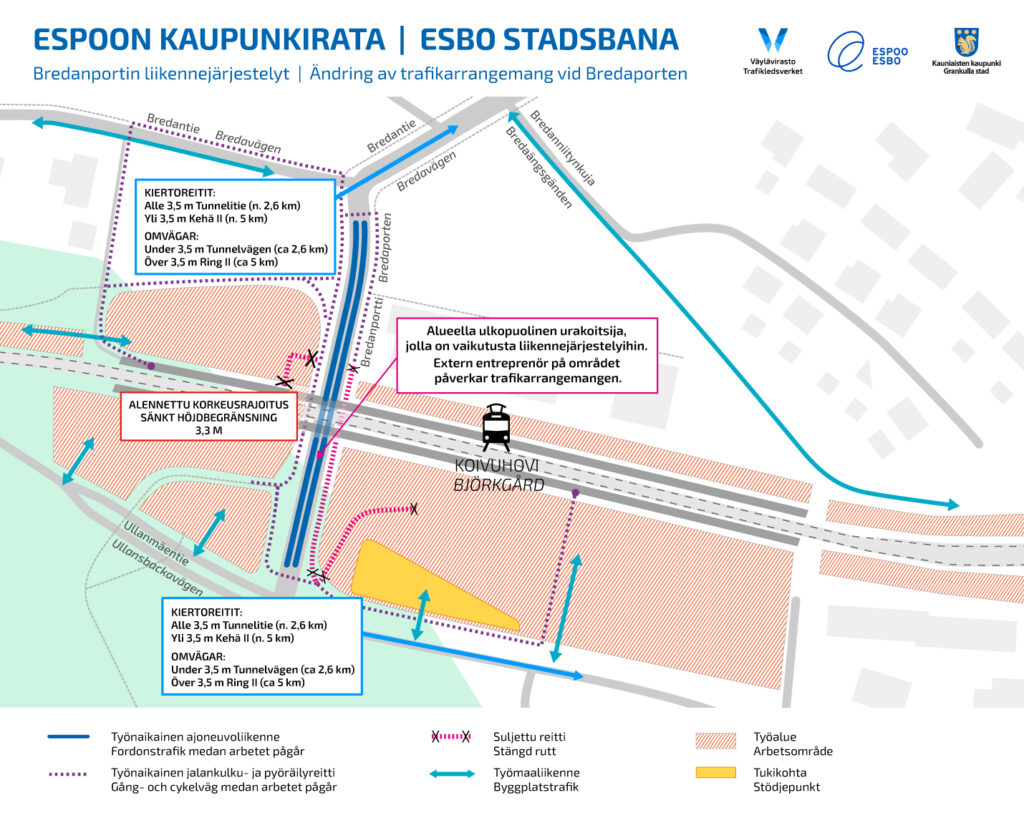 - Tulevan baanasillan rakennustöiden vuoksi Bredanportin alikulkua madalletaan nykyisestä neljästä metristä n. 3,3 metriin keskiviikkona 22.4.