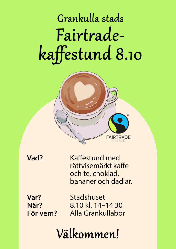 Under veckorna för rättvis handel (29.9.–12.10.2025) ordnar vi även detta år en Fairtrade-kaffestund i stadshuset onsdagen 8.10 kl. 14–14.30. Under kaffestunden bjuder vi på rättvisemärkt kaffe och te, choklad, bananer och dadlar. Tillställningen är öppen för alla Grankullabor.
