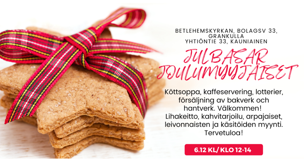 Köttsoppa, kaffeservering, lotterier, försäljning av bakverk och hantverk. 15% av intäkterna går till diakoniarbetet. Välkommen!