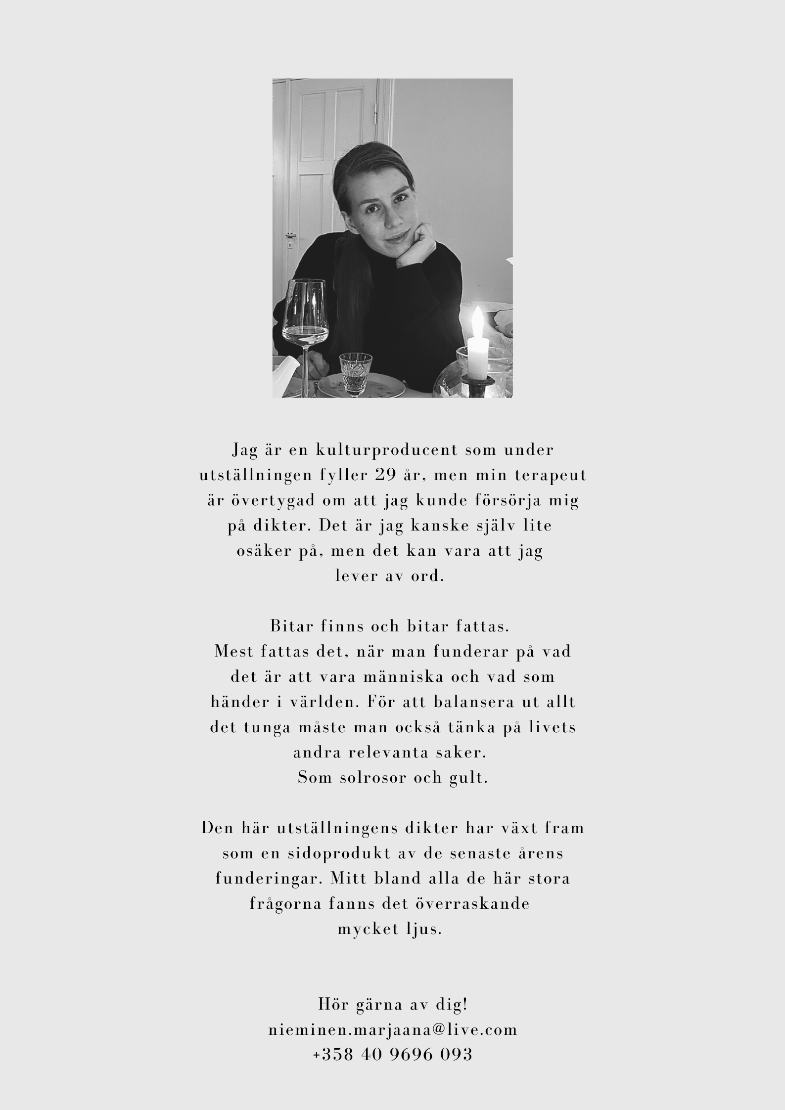 Maana Nieminens diktsamling “Bitar” innehåller dikter som behandlar livets märkliga kontraster, till exempel relationen mellan skuggorna och ljuset.