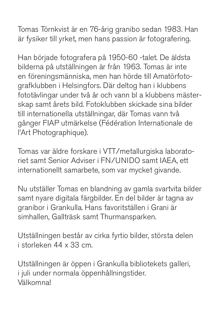 Nu utställer Tomas en blandning av gamla svartvita bilder samt nyare digitala färgbilder. En del bilder är tagna av granibor i Grankulla. Hans favoritställen i Grani är simhallen, Gallträsk samt Thurmansparken.