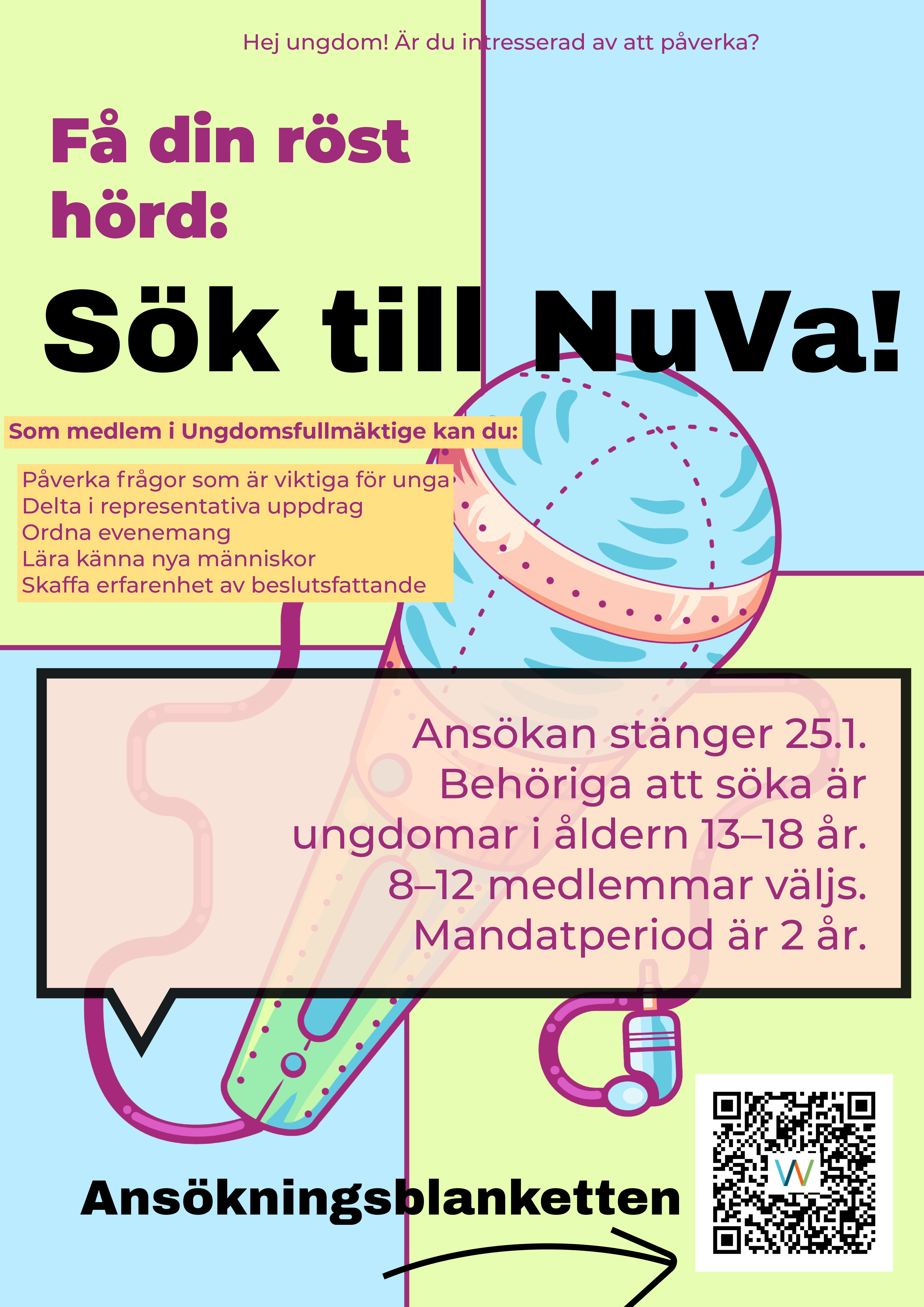 Fyll i Webropol-blanketten nedan och berätta kort varför just du skulle vara en bra medlem i ungdomsfullmäktige – vad du vill utveckla och vilka frågor du vill påverka.