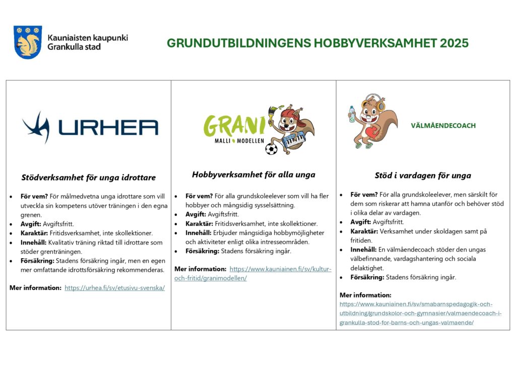Grankulla stad har fått ett betydelsefullt tillskott i de unga idrottarnas vardag när Urhea-verksamheten startade i slutet av augusti 2025. Urhea är Finlands Olympiska kommittés officiella idrottsakademi, som stöder unga idrottare i deras dagliga träning, i att kombinera studier och idrott samt erbjuder experttjänster som stöd för träningsverksamheten. Under hösten 2025 har eleverna i årskurs sju från Kauniaisten peruskoulu och Grundskolan i Grankulla deltagit – sammanlagt nästan 90 elever från olika grenar. Under 2026 är Urhea-verksamheten för 7.–8.-klassare och under läsåret 2027–2028 täcker verksamheten hela högstadiet.