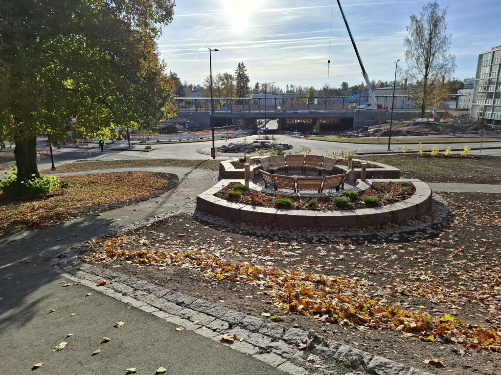 Nivån på gatuområdet på södra sidan har sänkts avsevärt och därför var det nödvändigt för staden att bygga om parkens södra del och gångar. Vi förnyade också belysningen i parken. Mitt i parken, bredvid den stora linden finns nu en helt ny vistelseplats. På grund av höjdskillnaderna i parken är gångvägarna belagda med bindande stenmjöl (Organic Lock) som tål erosion bättre än icke bindande material. I nedre delen av den västra gångvägen finns nu en trappa, vilket avviker från den ursprungliga planen. Infrastrukturen under jord och berggrunden som uppdagades på den här platsen medförde att den planerade rampen inte kunde byggas. Handledare kommer att installeras på trappan senare i år. Parkens planteringsarbeten färdigställs våren 2026.