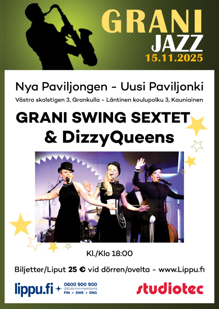 Kauniaisten jazzmusiikin kannatusyhdistys ry järjestää lauantaina 15.11.2025 klo 18– 20 vuosittaisen syyskonsertinsa Kauniaisten Uudessa Paviljongissa. Luvassa on svengaavaa naisenergiaa ja maamme kärkimuusikoista kootun sekstetin tarjoamaa melodista lattarimusiikkia sekä swingiä ja perinnejazzia.