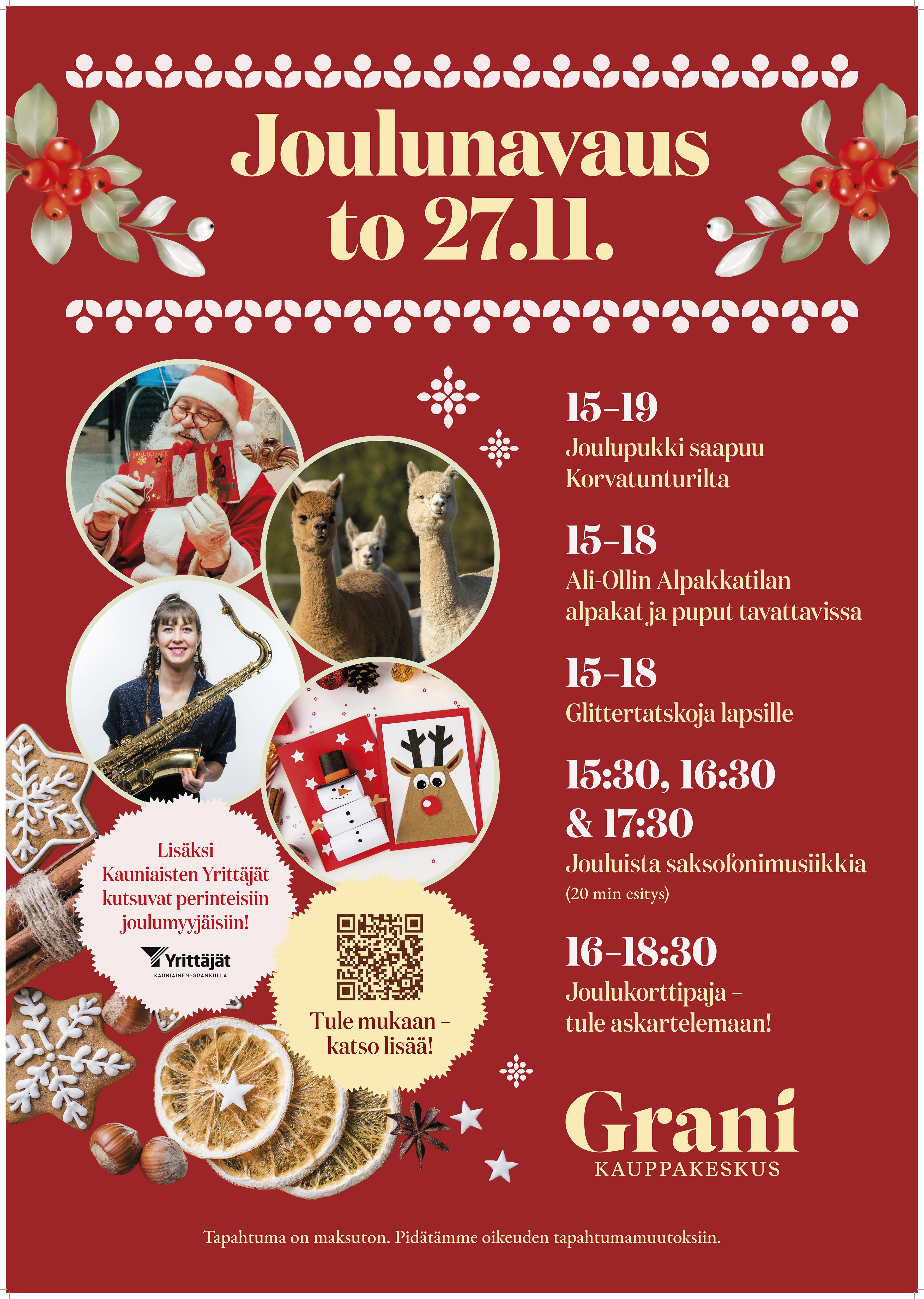 - 16–18:30: Joulukorttipaja – tule askartelemaan!