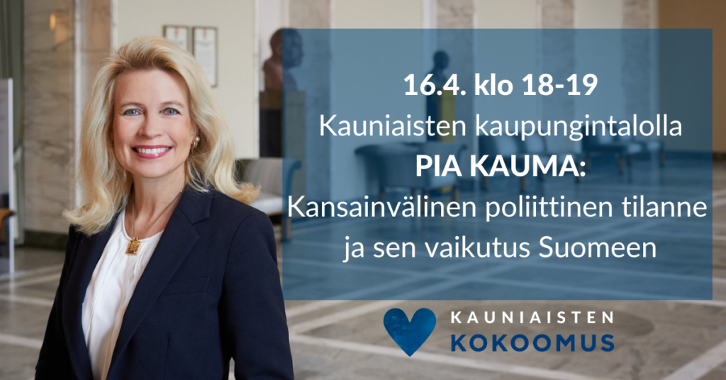 Kansanedustaja Pia Kauma vierailee Kauniaisten kaupungintalolla valtuustosalissa torstaina 16.4. klo 18-19. Aiheena on kansainvälinen poliittinen tilanne ja sen vaikutus Suomeen. Tilaisuus on kaikille avoin. Tervetuloa mukaan keskustelemaan!
