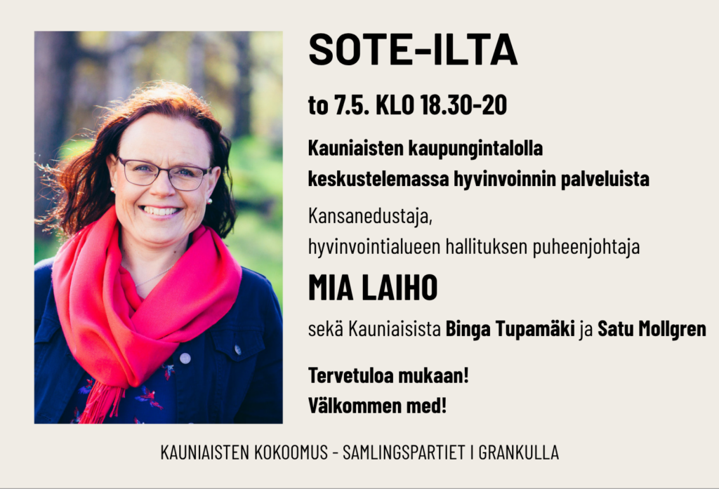 Länsi-Uudenmaan hyvinvointialueen aluehallituksen puheenjohtaja, kansanedustaja ja mm. eduskunnan sosiaali- ja terveysvaliokunnan varapuheenjohtaja Mia Laiho on paikalla Kauniaisten sote-illassa ja kertoo sote-palveluiden viimeisimmät kuulumiset.