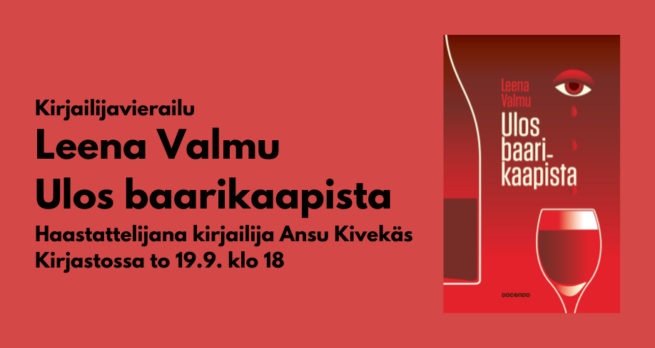 Biotieteiden dosentti ja kirjailija Leena Valmu vierailee kirjastolla kertomassa omakohtaisesta Ulos baarikaapista -kirjastaan. Teos on henkilökohtainen tarina kansainvälisissä johtotehtävissä toimineen naisen alkoholiongelmasta sekä yksinäisestä taistelusta saada se hallintaan. Kirja pureutuu yhteiskunnassamme pitkälti vaiettuun tabuun, hyvin pärjäävien naisten alkoholiongelmaan. Valmua haastattelee kirjailija Ansu Kivekäs.