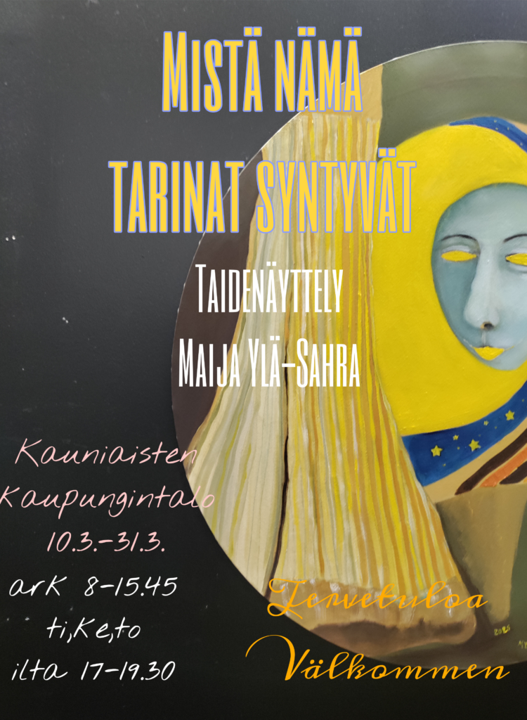 Espoolainen kuvataiteilija Maija Ylä-Sahra tuo Kauniaisten kaupungintalon näyttelytilaan öljyvärimaalauksiaan viimevuosien ajoilta, sillä hän aloitti maalaamisen Kauniaisten vanhan Postin talossa työhuoneessaan v. 2002. Paluu juurilleen näinollen taiteen kautta. Maija on osallistunut lukuisiin näyttelyihin myös ulkomailla esim. Italiassa (Firenzen Biennale, Cortona, Milanon kulttuurikeskus, Rooma taidekirja).Hän aloitti taideopinnot aikanaan Toscanassa, Luccassa asuessaan.