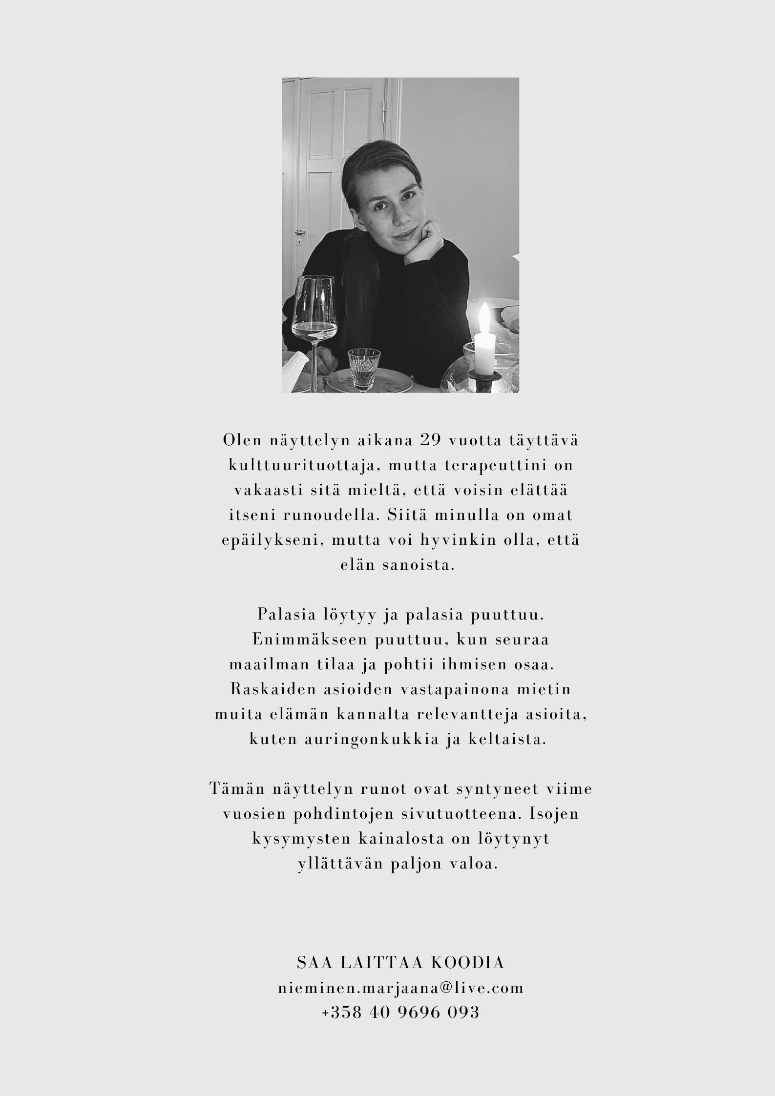 Maana Niemisen Palasia-niminen kokonaisuus sisältää runoja, jotka usein käsittelevät elämälle ominaisten kontrastien kuten varjojen ja valon suhdetta.