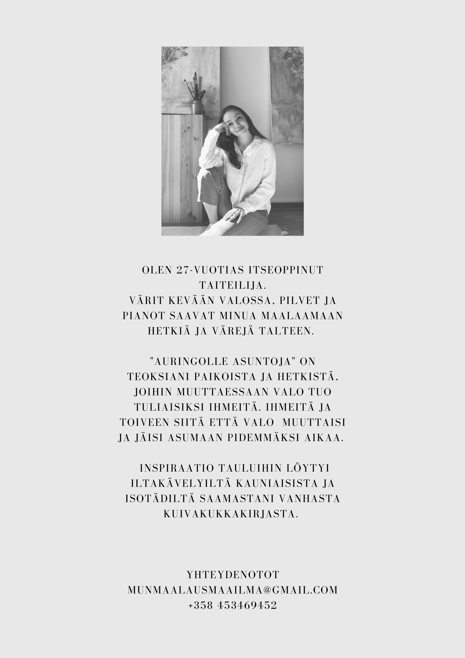 Auringolle asuntoja esittelee Jenni Holman maalauksia, joihin inspiraatio on löytynyt muun muassa Kauniaisten puistoista ja järveltä.