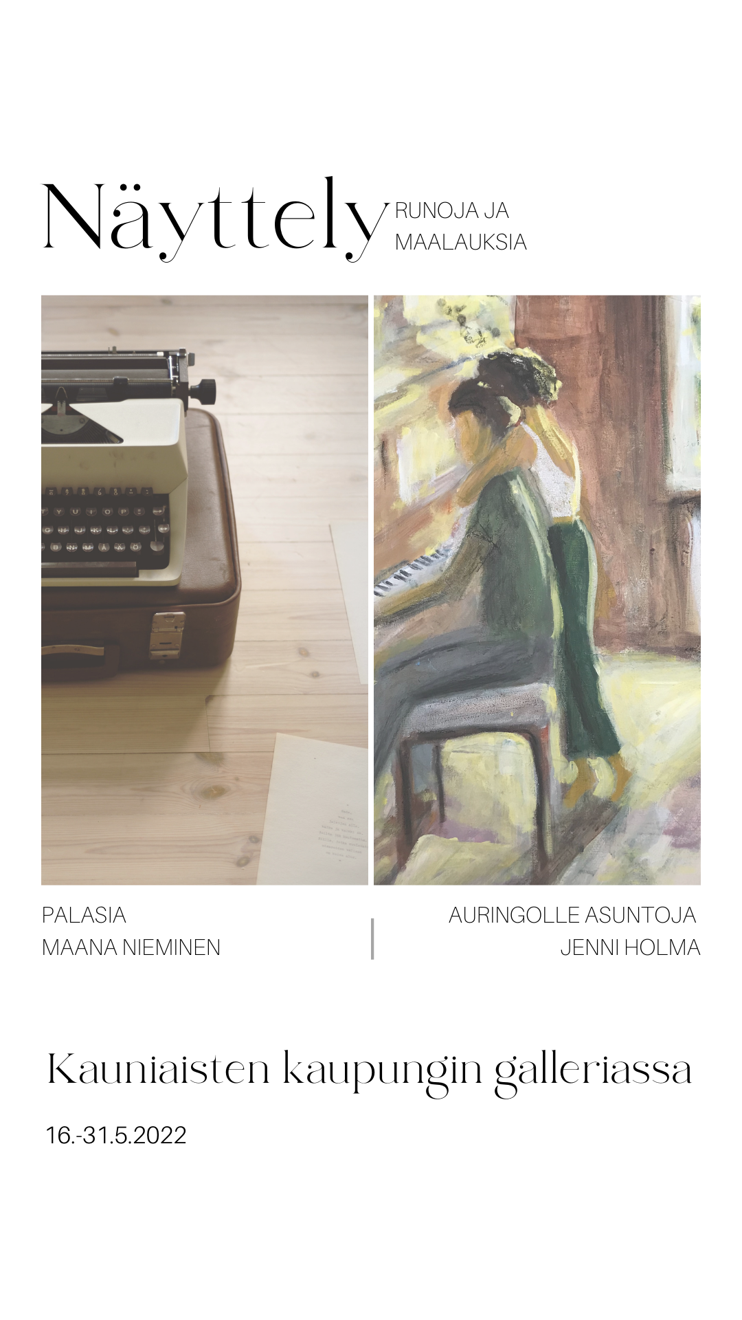 Kauniaisten Galleriassa on toukokuun lopun ajan esillä Jenni Holman maalauksista ja Maana Niemisen runoista koostuva yhteisnäyttely.
