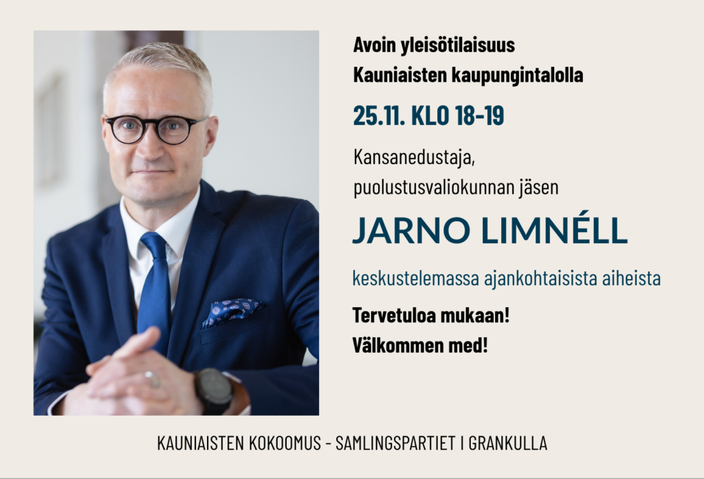 Kaikille avoin yleisötilaisuus tiistaina 25.11. Kansanedustaja Jarno Limnéll kaupungintalolla keskustelemassa ajankohtaisista aiheista.