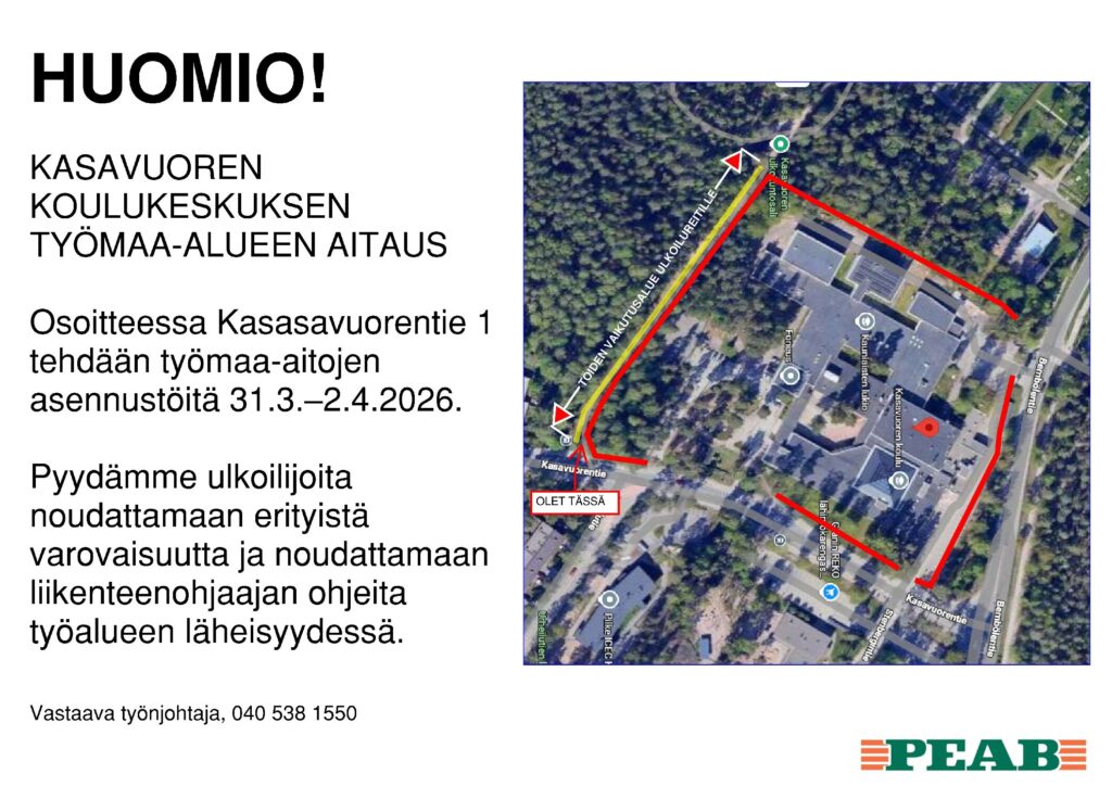 Kasavuoren koulukeskuksen rakennushankkeen työt alkavat viikolla 14. Työt aloitetaan työmaan perustamisella. Ensimmäinen näkyvä työvaihe on koulun tontin ja työmaa-alueen aitaaminen.
