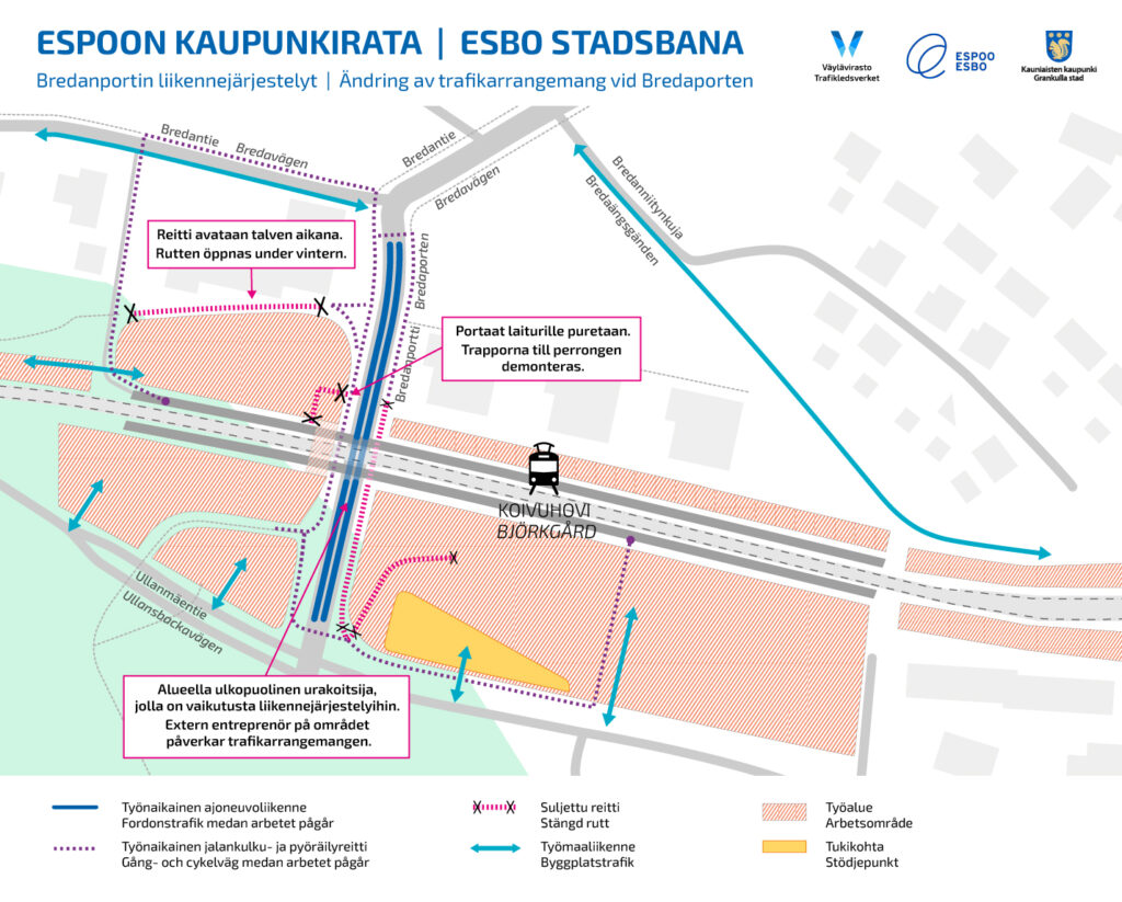 Bredanportin portaat Koivuhovin laiturialueelle suljetaan maanantaina 19.1.2026. Kohdalla aloitetaan uuden baanasillan rakentaminen. Kiertoreitti Bredantien kautta opastetaan maastossa.