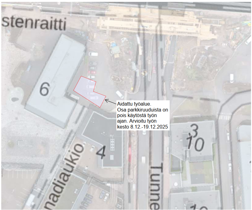 Kaupunkirataan liittyvä johtolinjan tulppaustyö alkaa maanantaina 8.12. osoitteessa Tunnelitie 6. Työalue aidataan, ja osa pysäköintialueen parkkiruuduista on pois käytöstä työn ajan. Työ kestää arviolta noin kaksi viikkoa, 19.12. saakka.