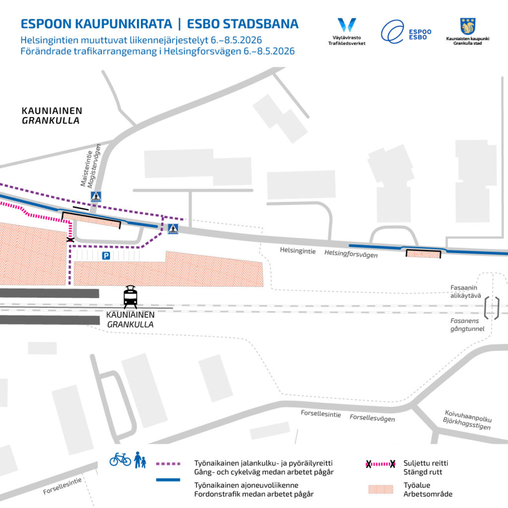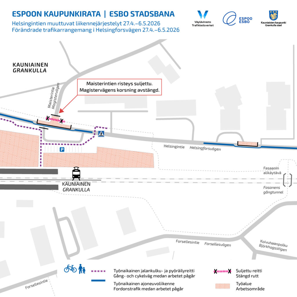Lisäksi Helsingintiellä, Fasaanin alikulun kohdalla, toinen moottoriajoneuvokaista suljetaan kiveystöiden takia 6.5.–8.5. väliseksi ajaksi.
